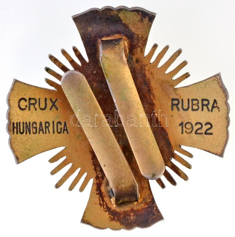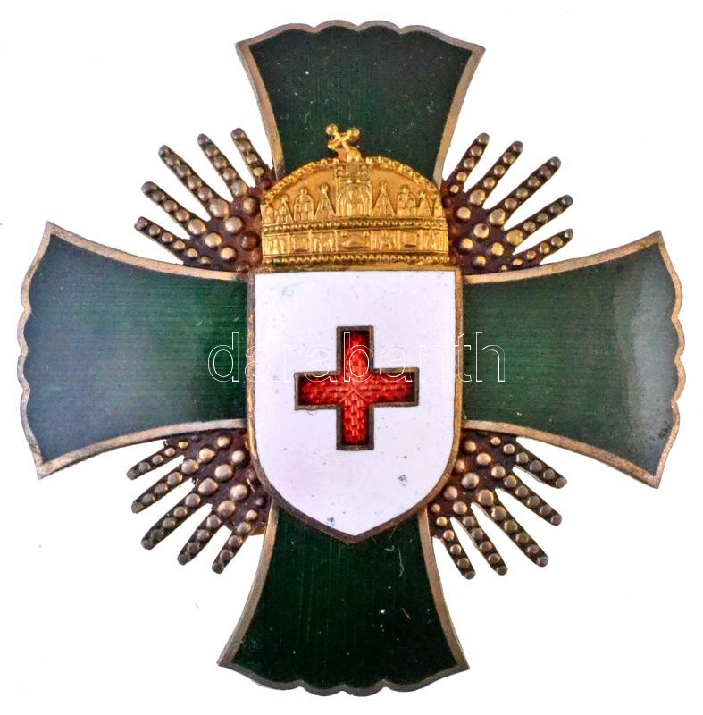 1922. "A Magyar Vöröskereszt Érdemkeresztje" zománcozott és aranyozott, jelzetlen Ag kereszt, kitűző helyett ferde pánttal, a hátlapi felirat vízszintes (48mm) T:1-,2 / Hungary 1922. "Hungarian Red Cross, Cross of Merit" enamelled and gold plated, unmarked Ag decoration, oblique strap instead of pin, the reverse text is horizontal (48mm) C:AU,XF NMK 338.