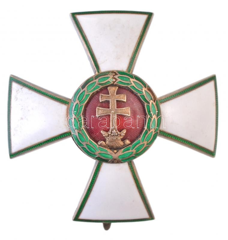 Hungary 1935-1945. "Hungarian Cross of Merit, 3rd Class" gold plated and enamelled Br decoration with vertical pin (50mm) C:XF some enamel missing