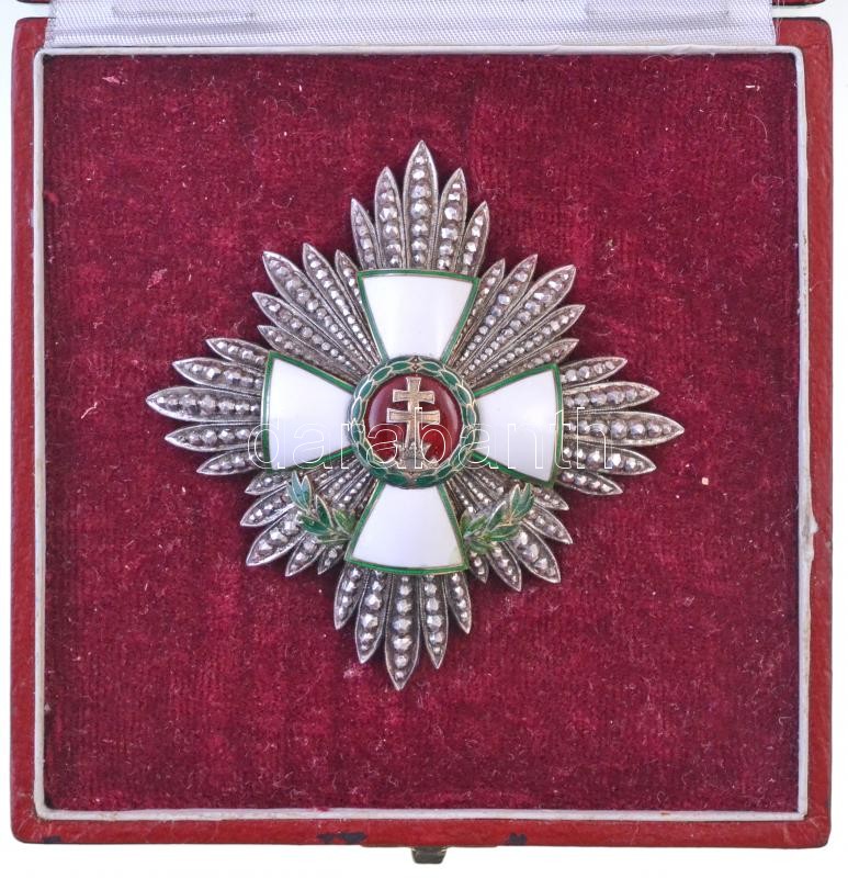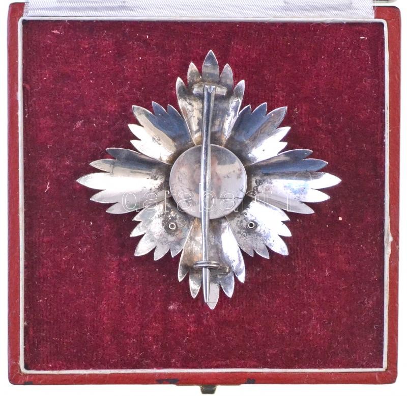 1939. "A Magyar Érdemrend középkeresztjének csillaga hadiékítménnyel" brillantírozott, jelzetlen Ag csillag, rajta zománcozott kereszt, hátoldalán függőleges tűvel, nem eredeti dísztokban (80mm) T:2 a babérágak javítottak, ragasztás nyomaival, medalion hátoldalán sérülés, alsó keresztszáron kis zománcjavítás / Hungary 1939. "Hungarian Order of Merit, Star with war decoration" unmarked Ag star with enamelled cross on it, with vertical pin on back, not in original case (80mm) C:XF the laurels are repaired, with glue marks, damage on back of the medalion, enamel repaired on the lower arm of the cross