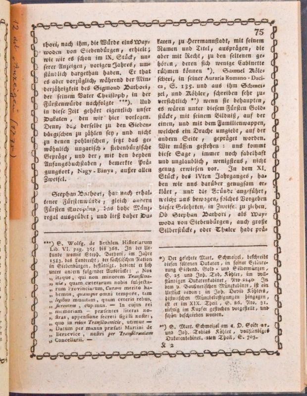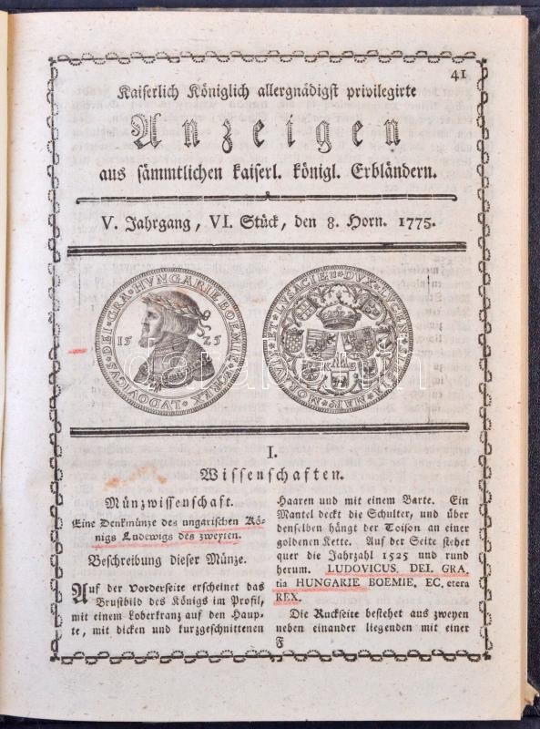 "Allergnädigst-privilegirte Anzeigen aus sämmtlich kais. königlichen Erbländern" folyóirat magyar vonatkozású cikkeket tartalmazó 1775-1776. évi számainak kolligátuma, összesen tizenegy lapszámból. Bécs, 1775-1776. + Az előbbihez hozzákötve: Florianus Augustus Reichel: De numero et pondere in nummis aestimando - Dissertatio quam illustris ictorum ordinis auctoritate pro obtinendis summis in utroque jure honoribus. Lipcse, 1777. Modern kötésben, jó állapotban, az utolsó lap szélei ragasztva. / Colligate of the Hungarian-related articles of the "Allergnädigst-privilegirte Anzeigen aus sämmtlich kais. königlichen Erbländern" published between 1775-1776, from 11 issues in total. + Bound together with: Florianus Augustus Reichel: De numero et pondere in nummis aestimando - Dissertatio quam illustris ictorum ordinis auctoritate pro obtinendis summis in utroque jure honoribus. Leipzig, 1777. Modern hardcover, in good condition, the last page is taped.