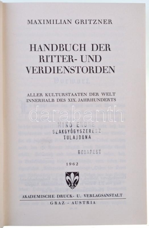 Ausztria Maximilian Gritzner: Handbuch der Ritter- und Verdientsorden (Lovagi- és érdemérmek kézikönyve), Akademische Druck- U. Verlagsanstalt, 1962. Sérült, használt karton tokban. / Maximilian Gritzner: Handbuch der Ritter- und Verdientsorden (Handbook of the Knights and Merit Orders), Akademische Druck- U. Verlagsanstalt, 1962. In damaged, used cardboard case.
