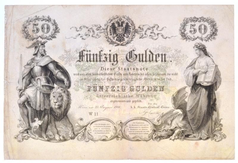 1866. 50G vízjeles papíron T:III részben restaurált / Hungary 1866. 50... https://www.darabanth.com/de/28-Gross-Auktion/28.1/Numismatik/Ungarische-und-Auslandische-Banknoten~11276/1866-50G-vizjeles-papiron-TIII-reszben-restauralt-Hungary-1866-50-Gulden-on-watermarked-pap~II1680520