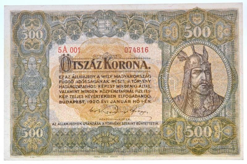 1920. 500K "Orell Füssli Zürich" "5A001 074816" T:... https://www.darabanth.com/de/28-Gross-Auktion/28.1/Numismatik/Ungarische-und-Auslandische-Banknoten~11276/1920-500K-Orell-Fussli-Zurich-5A001-074816-TII-Hungary-1920-500-Korona-Orell-Fussli-Zu~II1680325