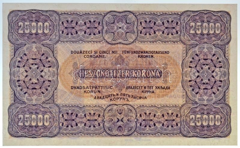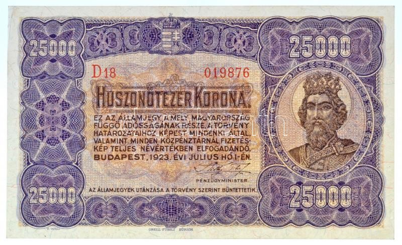 1923. 25.000K "Orell Füssli Zürich", "D18 019876" T:II egy függőleges hajtás a bankjegy közepén és szamárfül a bal felső sarokban / Hungary 1923. 25.000 Korona "Orell Füssli Zürich", "D18 019876" C:XF one vertical fold on the middle of the banknote and one small fold in the upper left corner Krause K44