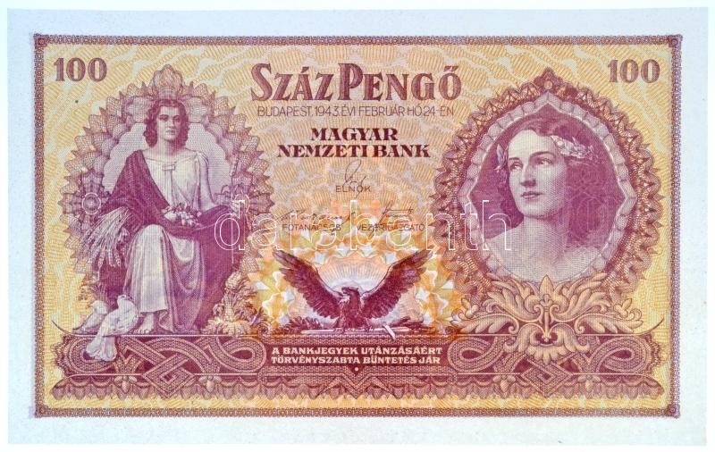 1943. 100P "Szálasi-kiadás" kiadatlan, sor- és sorozatszám nélkül T:I / Hungary 1943. 100 Pengő "Szálasi edition" officialy unissued, without serial number C:UNC