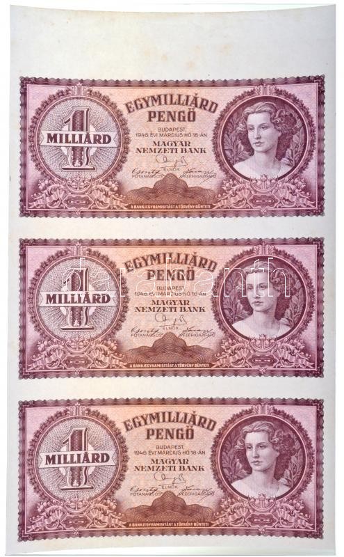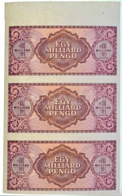 1946. 1.000.000.000P sorozat és sorszám nélkül, hármas ívszéli ívben T:I R! / Hungary 1946. 1.000.000.000 Pengő without serial numbers, in a sheet of three, edge sheet C:UNC Rare!