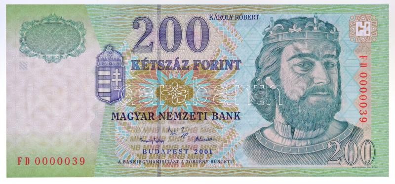 2001. 200Ft alacsony "FD 0000039" T:I / Hungary 2001. 200 Fo... https://www.darabanth.com/de/28-Gross-Auktion/28.1/Numismatik/Ungarische-und-Auslandische-Banknoten~11276/2001-200Ft-alacsony-FD-0000039-TI-Hungary-2001-200-Forint-with-low-FD-0000039-serial-number~II1652919