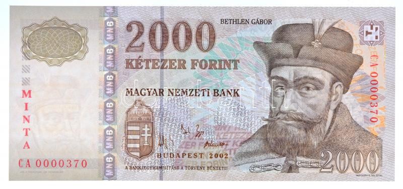 2002. 2000Ft "MINTA" "CA 000370" sorszámmal T:I / ... https://www.darabanth.com/de/28-Gross-Auktion/28.1/Numismatik/Ungarische-und-Auslandische-Banknoten~11276/2002-2000Ft-MINTA-CA-000370-sorszammal-TI-Hungary-2002-2000-Forint-MINTASPECIMEN-with-~II1651675