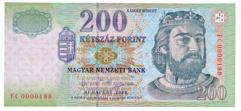 2002. 200Ft alacsony "FC 0000188" T:I / Hungary 2002. 200 Fo... https://www.darabanth.com/de/28-Gross-Auktion/28.1/Numismatik/Ungarische-und-Auslandische-Banknoten~11276/2002-200Ft-alacsony-FC-0000188-TI-Hungary-2002-200-Forint-with-low-FC-0000188-serial-number~II1652930