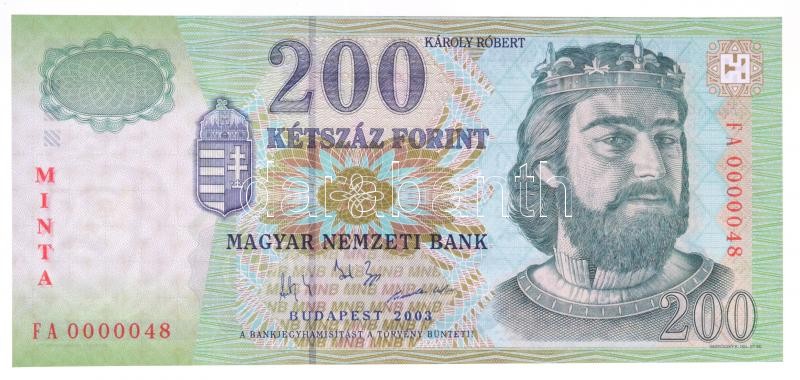 2003. 200Ft "MINTA" felülnyomással "FA 0000048" sorszámmal T:I / Hungary 2003. 200 Forint with red "MINTA(SPECIMEN)" overprint and "FA 0000048" serial number C:UNC