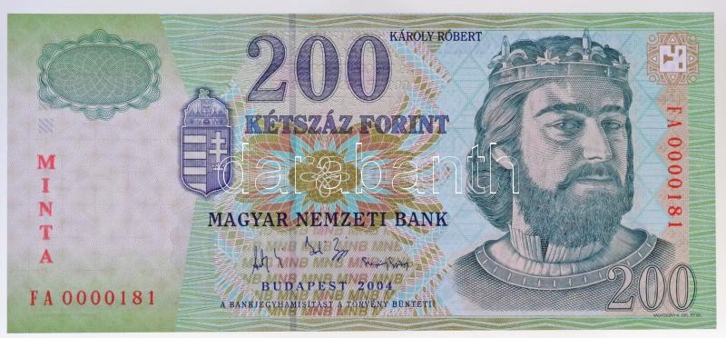 2004. 200Ft "MINTA" felülnyomással, "FA 0000181" sorszámmal T:I / Hungary 2004. 200 Forint with red "MINTA(SPECIMEN)" overprint and "FA 0000181" serial number C:UNC