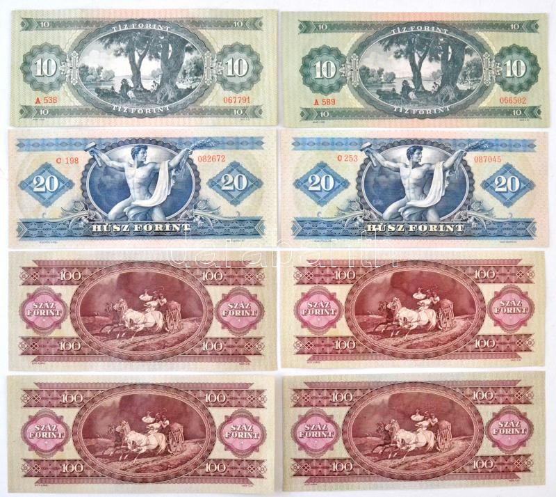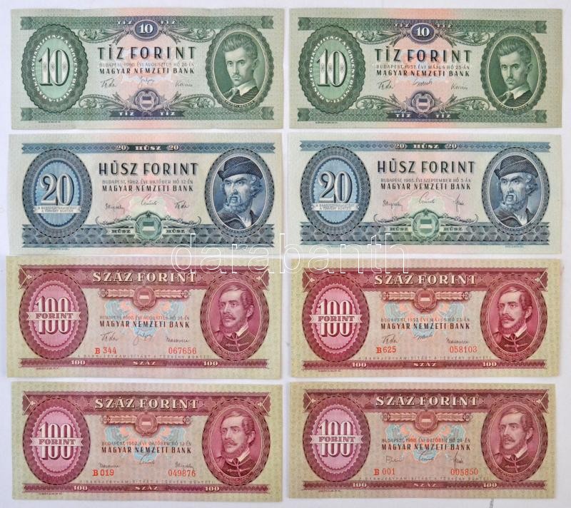 Vegyes 8db-os kiváló tartású forint bankjegy tétel, benne: 1957-1960. 10Ft (2xklf) + 1962-1965. 20Ft (2xklf) + 1957-1968. 100Ft (4xdiff) T:I Mixed 8pcs of Forint banknotes in exceptional condition, with: 1957-1960. 10 Forint (2xdiff) + 1962-1965. 20 Forint (2xdiff) + 1957-1968. 100 Forint (4xdiff) C:UNC Adamo F4, F5, F13, F14, F29, F30, F31, F32