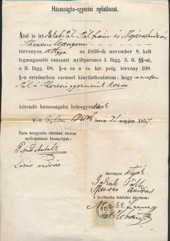 1857 Házasságba-egyezési nyilatkozat, Cegléd, 6kr okmánybélyeggel, alá... https://www.darabanth.com/de/280-Fernauktion/280.0/Andere-Sammelgebiete/Dokument~16/1857-Hazassagba-egyezesi-nyilatkozat-Cegled-6kr-okmanybelyeggel-alairasokkal-hajtasokk~II1446104