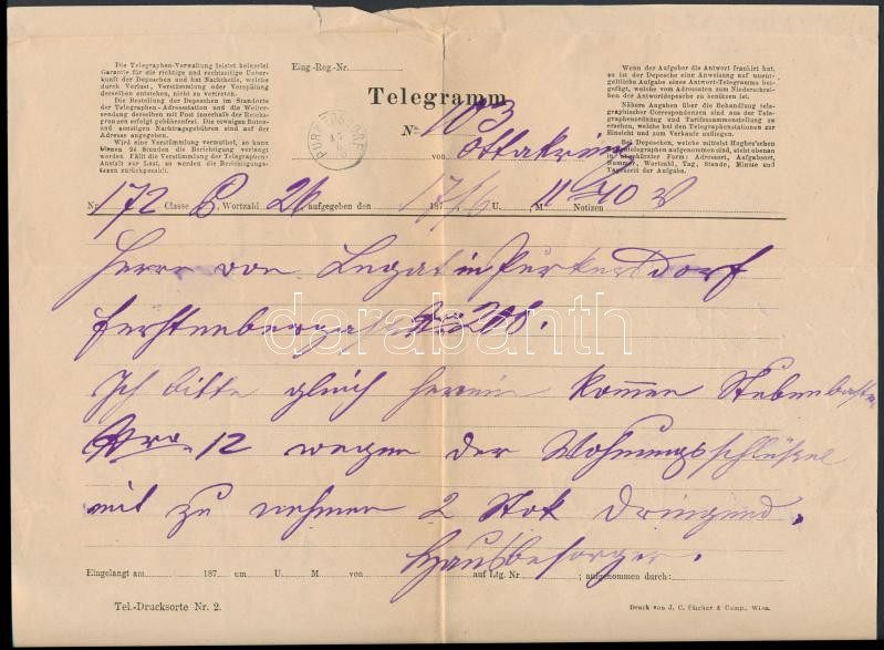 1871 Német nyelvű távirat "Pukersdor" bélyegzővel https://www.darabanth.com/de/280-Fernauktion/280.0/Andere-Sammelgebiete/Dokument~16/1871-Nemet-nyelvu-tavirat-Pukersdor-belyegzovel~II1445500