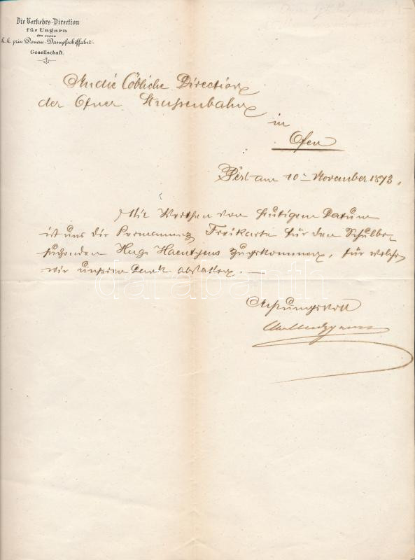 1873 Pest, Dunai Gőzhajózási Társaság(k. k. priv. Donau-Dampschiffahrt... https://www.darabanth.com/de/280-Fernauktion/280.0/Andere-Sammelgebiete/Dokument~16/1873-Pest-Dunai-Gozhajozasi-Tarsasagk-k-priv-Donau-Dampschiffahrt-Gesellschaft-levele-a-B~II1445017