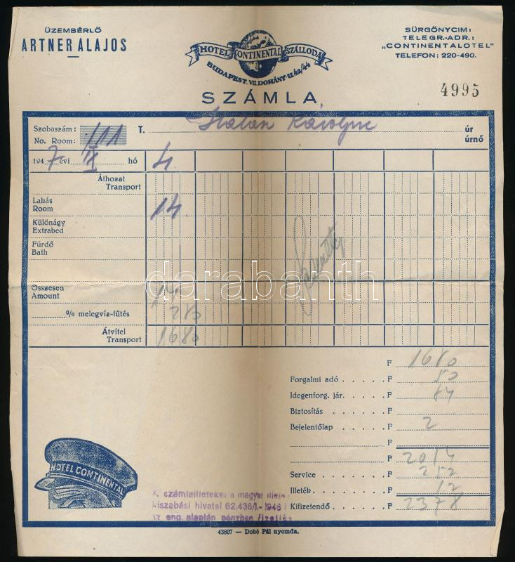 1947 Hotel Continental Szálloda számlája, a hátoldalán ceruzás feljegy... https://www.darabanth.com/de/280-Fernauktion/280.0/Andere-Sammelgebiete/Dokument~16/1947-Hotel-Continental-Szalloda-szamlaja-a-hatoldalan-ceruzas-feljegyzesekkel-21x19-cm~II1445902