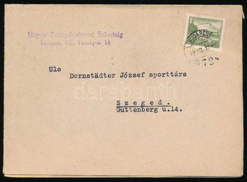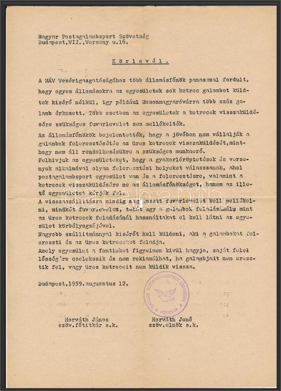 Beschreibung: 1959 Magyar Postagalambsport Szövetség körlevele a MÁV panaszainak ügyében, bélyeggel, pecséttel.