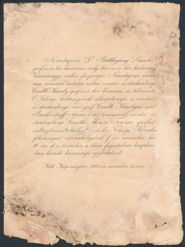 Beschreibung: 1898 Batthyány László gróf és Coreth Mária Terézia grófnő esküvői hirdetménye, megviselt állapotban