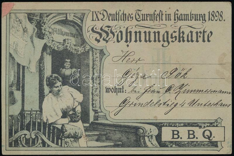 1898 Hamburg, IX. Deutsches Turnfest in Hamburg, Wohnungskarte(szállás... https://www.darabanth.com/de/280-Fernauktion/280.0/Andere-Sammelgebiete/Drucksachen~43/1898-Hamburg-IX-Deutsches-Turnfest-in-Hamburg-Wohnungskarteszallasigazolas~II1445184