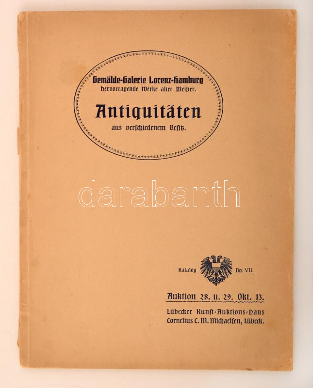 Beschreibung: 1913 Gemälde-Galerie Lorenz-Hamburg hervorragende Werke alter Meister. Antiquitäten aus verschiedenem Besitz, Katalog No. VII., árverési katalógus képekkel illsuztrálva