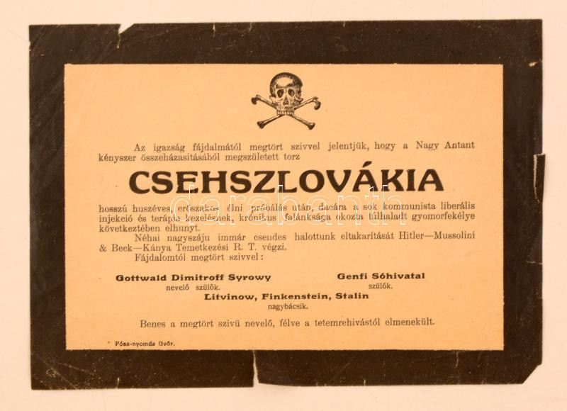 1939 Csehszlovákia haláláról értesítő humoros propaganda röplap https://www.darabanth.com/de/280-Fernauktion/280.0/Andere-Sammelgebiete/Drucksachen~43/1939-Csehszlovakia-halalarol-ertesito-humoros-propaganda-roplap~II1445472