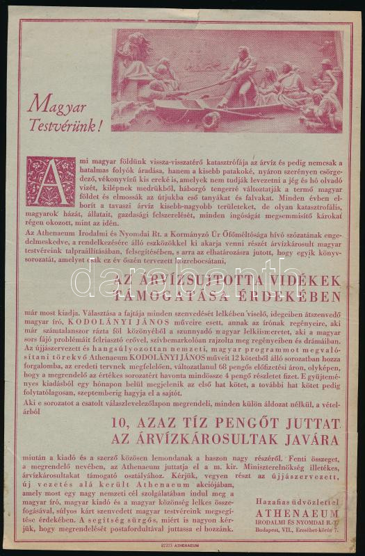 1940 Az Athenaeum Irodalmi és Nyomdai Rt. felhívása az árvíz károsultak javára történő gyűjtésről, a hátoldalán a Horthy Miklós kertváros építés vasbeton anyagkimutatása, ceruzával feljegyezve.