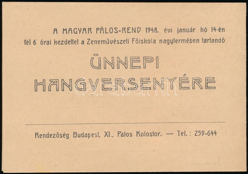 1948 Bp., A Magyar Pálos rend meghívója ünnepi hangversenyére https://www.darabanth.com/de/280-Fernauktion/280.0/Andere-Sammelgebiete/Drucksachen~43/1948-Bp-A-Magyar-Palos-rend-meghivoja-unnepi-hangversenyere~II1445276