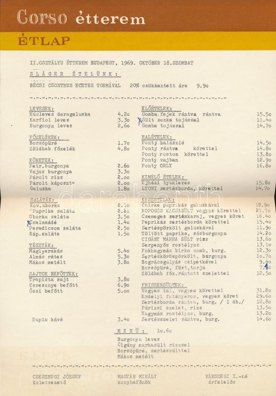 1969 Bp., A Corso étterem étel- és itallapja, 2 db https://www.darabanth.com/de/280-Fernauktion/280.0/Andere-Sammelgebiete/Drucksachen~43/1969-Bp-A-Corso-etterem-etel-es-itallapja-2-db~II1445070