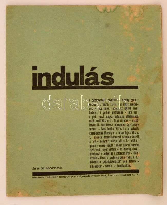 cca 1933-34 Indulás ifjúsági irodalmi folyóirat első száma. (Szerk.: Balázs Gyula). Losonc, Losonczi Sándor Könyvnyomdája. Kiadói kissé viseltes tűzött papírkötés, megviselt állapotban, foltos, szakadozott. Összesen négy száma jelent meg.