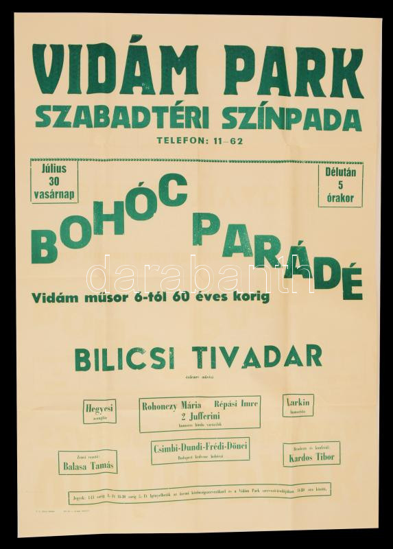 cca 1960 Nyári bohócparádé a Vidámparkban, többek között Bilicsi Tivad... https://www.darabanth.com/de/280-Fernauktion/280.0/Andere-Sammelgebiete/Drucksachen~43/cca-1960-Nyari-bohocparade-a-Vidamparkban-tobbek-kozott-Bilicsi-Tivadar-musoraval-Ofszet~II1444902
