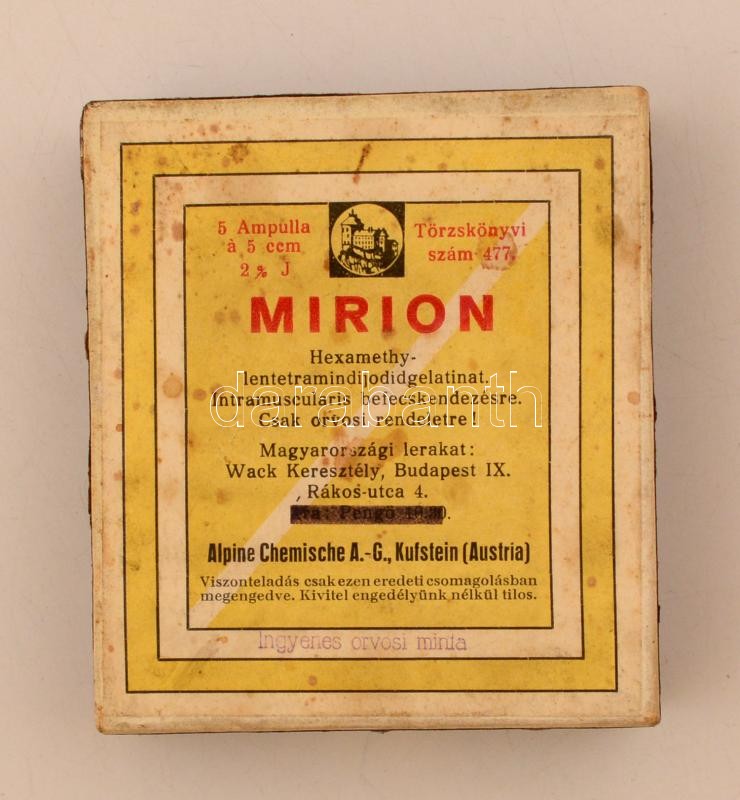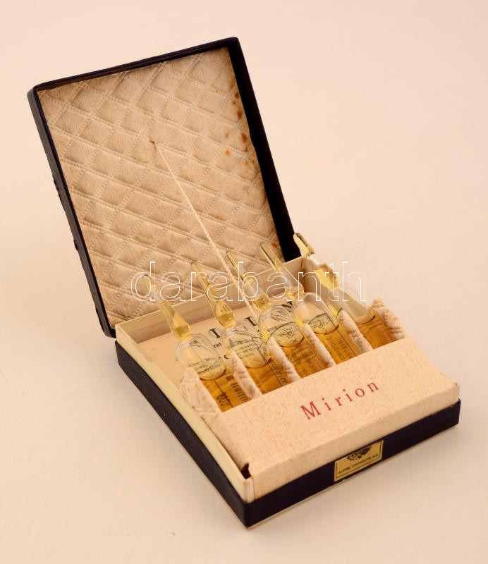 Beschreibung: Mirion ampulla, régi gyógyszeres doboz tartalommal, ingyenes orvosi minta