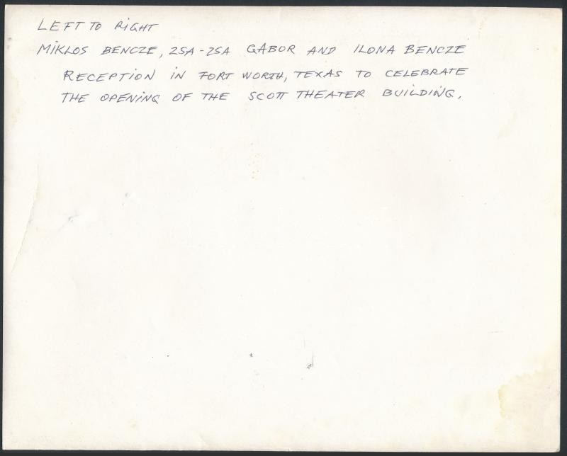 Bencze Miklós, Gábor Zsazsa és Bencze Ilona Texasban, fotó, hátulján f... https://www.darabanth.com/de/280-Fernauktion/280.0/Andere-Sammelgebiete/Foto~19/Bencze-Miklos-Gabor-Zsazsa-es-Bencze-Ilona-Texasban-foto-hatuljan-feliratozva-20-5C39725-5-c~II1442778