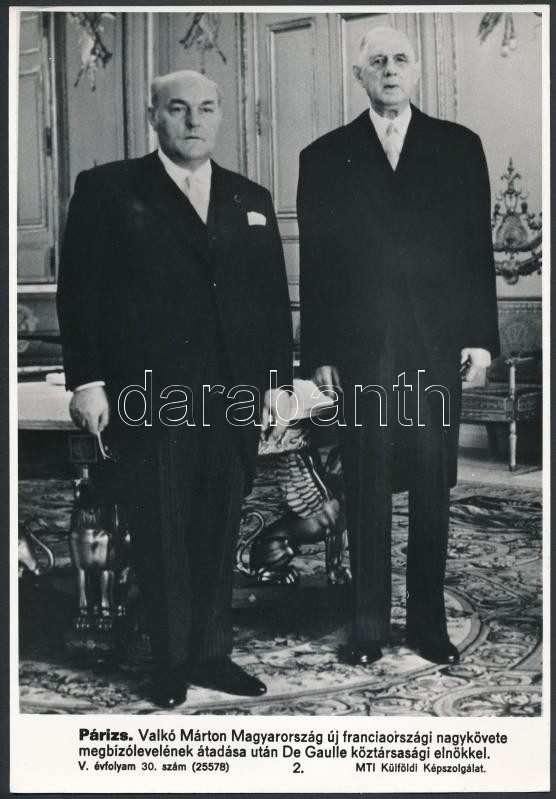 Valkó Márton franciaországi magyar nagykövet és De Gaulle, MTI fotó, f... https://www.darabanth.com/de/280-Fernauktion/280.0/Andere-Sammelgebiete/Foto~19/Valko-Marton-franciaorszagi-magyar-nagykovet-es-De-Gaulle-MTI-foto-feliratozva-27C39718-5-cm~II1442790
