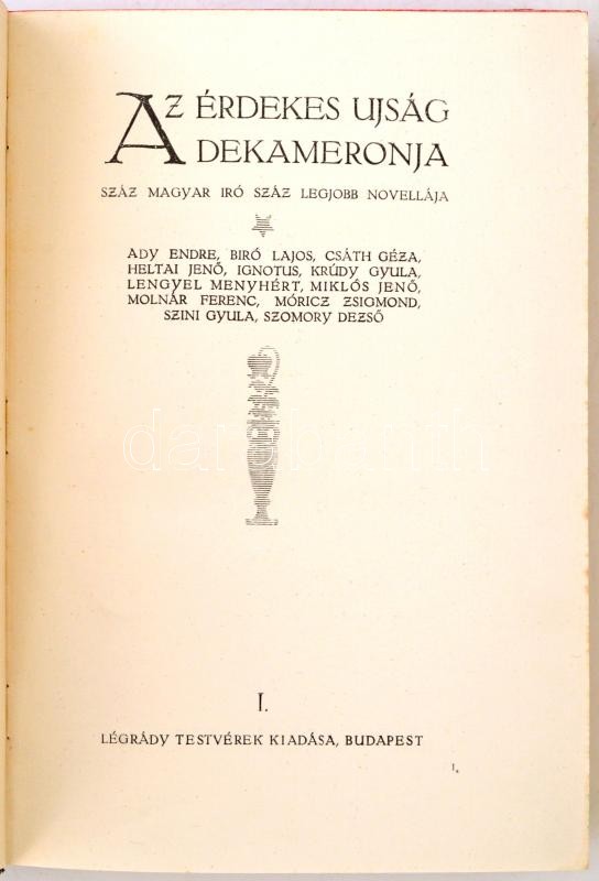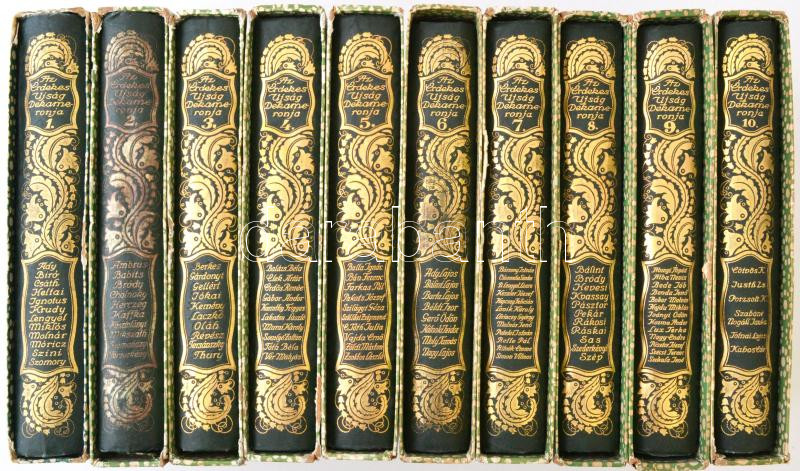 Az Érdekes Újság Dekameronja 1-10. kötet. Szerkeszti Kabos Ede. Száz magyar író száz legjobb novellája. Budapest, é.n., Légrády Testvérek. Kiadói aranyozott egészvászon kötés, kiadói karton dobozban, a felső lapélek festettek, a szerzők arcképeivel. A II. gerince kopott, de ezt leszámítva szép állapotban. Ady Endre, Csáth Géza, Balázs Béla, Babits Mihály, Karinthy Frigyes, Kosztolányi Dezső, és mások írásaival.