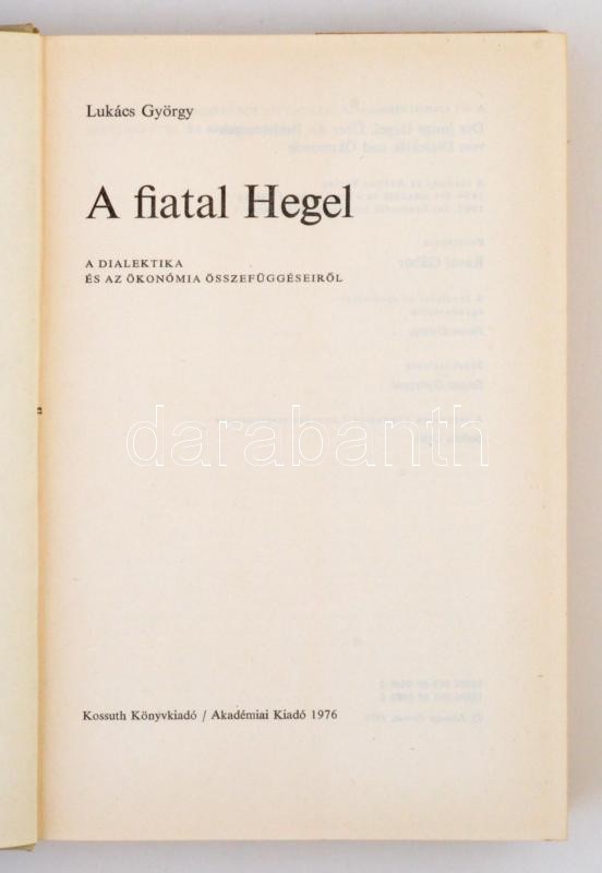 Lukács György: A fiatal Hegel. A dialektika és az ökonómia összefüggéseiről. Budapest, 1976, Kossuth Könyvkiadó-Akadémiai Kiadó. Kiadói egészvászon kötés, kiadói papírborítóban.