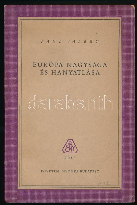 Paul Valéry: Európa nagysága és hanyatlása. Fordította Kemény Katalin.... https://www.darabanth.com/de/280-Fernauktion/280.0/Bucher/Bucher-Sonstige-Raritaten~41/Paul-Valery-Europa-nagysaga-es-hanyatlasa-Forditotta-Kemeny-Katalin-Budapest-1945-Egyete~II1445263