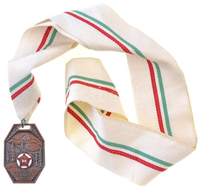 1959. "Május 1. Verseny" Br lyukasztott emlékplakett, nyakszalaggal (2... https://www.darabanth.com/de/280-Fernauktion/280.0/Numismatik/Faleristik-Auszeichnungen-Medaillen-Ordnen~300017/1959-Majus-1-Verseny-Br-lyukasztott-emlekplakett-nyakszalaggal-28x40mm-T2~II1444075