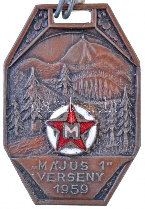 Beschreibung: 1959. "Május 1. Verseny" Br lyukasztott emlékplakett, nyakszalaggal (28x40mm) T:2