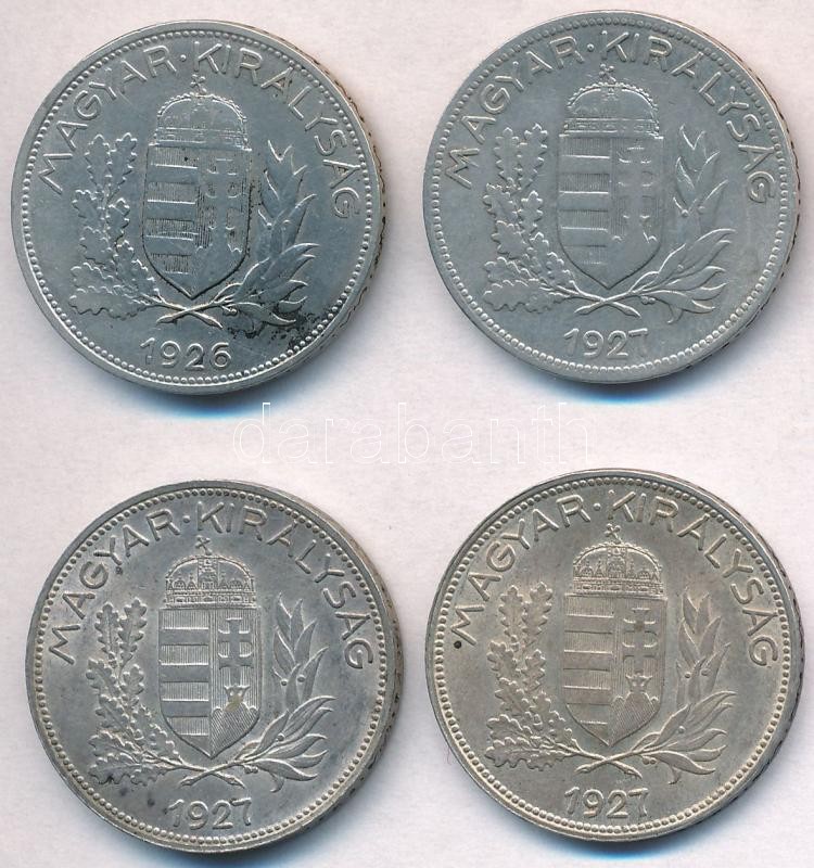 1926-1927. 1P Ag (4x) T:2 patina Adamo P6 https://www.darabanth.com/de/280-Fernauktion/280.0/Numismatik/Ungarische-Munzen-und-Munzen-mit-ungarischem-Munzzeichen~300008/1926-1927-1P-Ag-4x-T2-patina-Adamo-P6~II1442082
