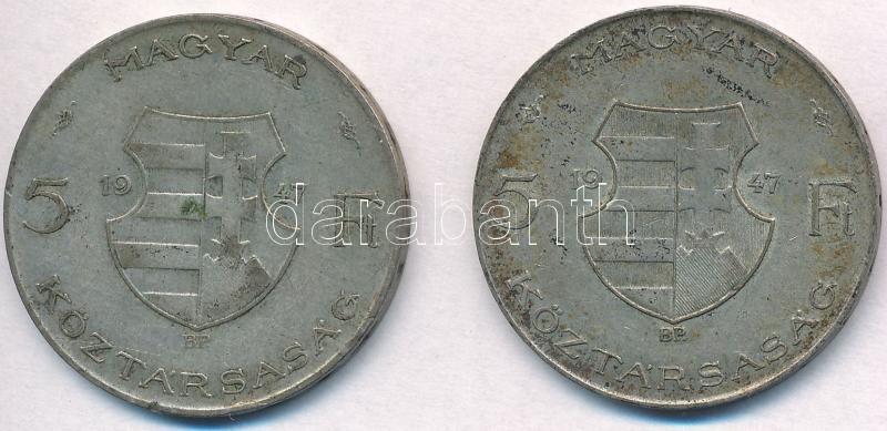 1947. 5Ft Ag Kossuth (2x) T:2 https://www.darabanth.com/de/280-Fernauktion/280.0/Numismatik/Ungarische-Munzen-und-Munzen-mit-ungarischem-Munzzeichen~300008/1947-5Ft-Ag-Kossuth-2x-T2~II1441567