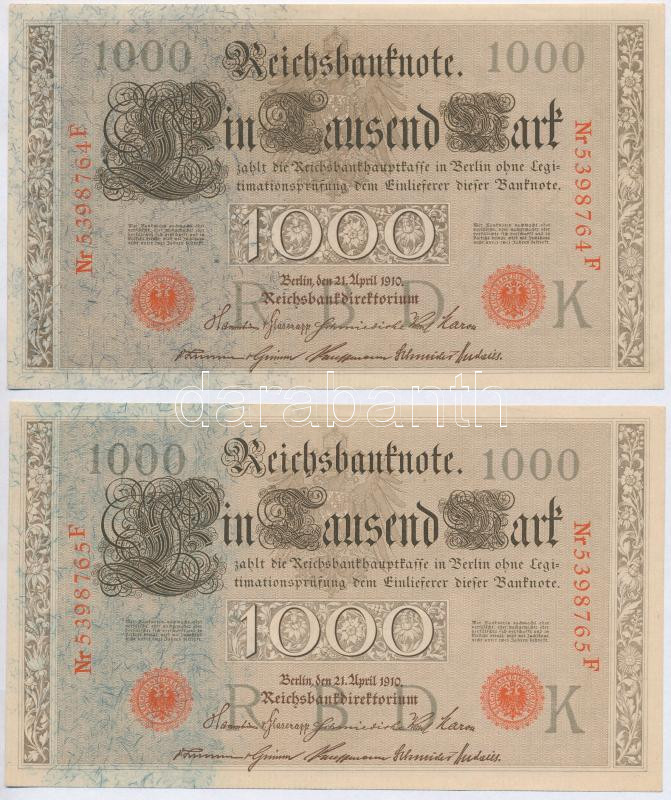Német Birodalom 1910. 1000M (5x) két sorszámkövető párral, hétjegyű sorszám, piros pecséttel T:I-II