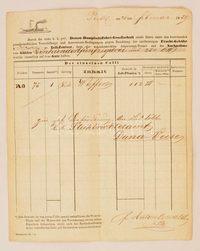 Beschreibung: 1869 DDSG fuvarlevél Pest Szalk. Fegyverrakománnyal / 1869 DDSG Bill of freight