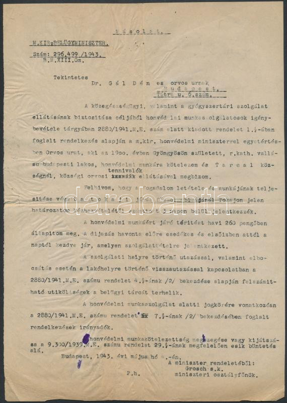 1943 Bp., Orvos számára kiállított honvédelmi munkára kötelező okmány ... https://www.darabanth.com/de/281-Fernauktion/281.0/Andere-Sammelgebiete/Dokument~16/1943-Bp-Orvos-szamara-kiallitott-honvedelmi-munkara-kotelezo-okmany-masolata~II1451216