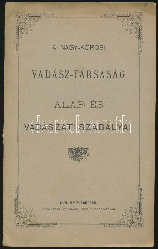 1889 A Nagykőrösi Vadásztársaság alap és vadászati szabályai. Nagykőrö... https://www.darabanth.com/de/281-Fernauktion/281.0/Andere-Sammelgebiete/Drucksachen~28/1889-A-Nagykorosi-Vadasztarsasag-alap-es-vadaszati-szabalyai-Nagykoros-1889-Ottinger-1~II1453208