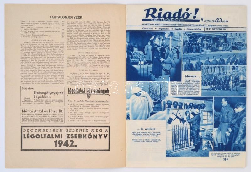 1941 A Riadó! A Légoltalmi Liga V. évfolyamának 23. száma https://www.darabanth.com/de/281-Fernauktion/281.0/Andere-Sammelgebiete/Drucksachen~28/1941-A-Riado-A-Legoltalmi-Liga-V-evfolyamanak-23-szama~II1450310