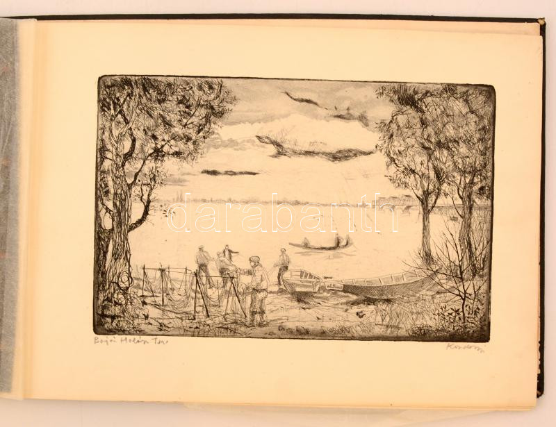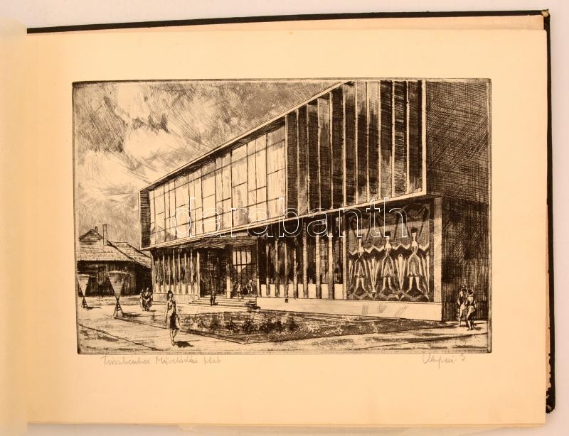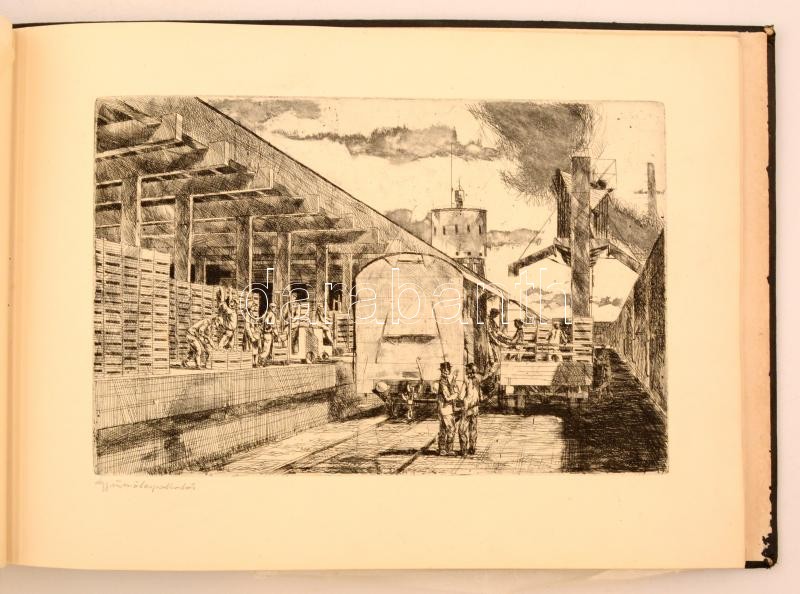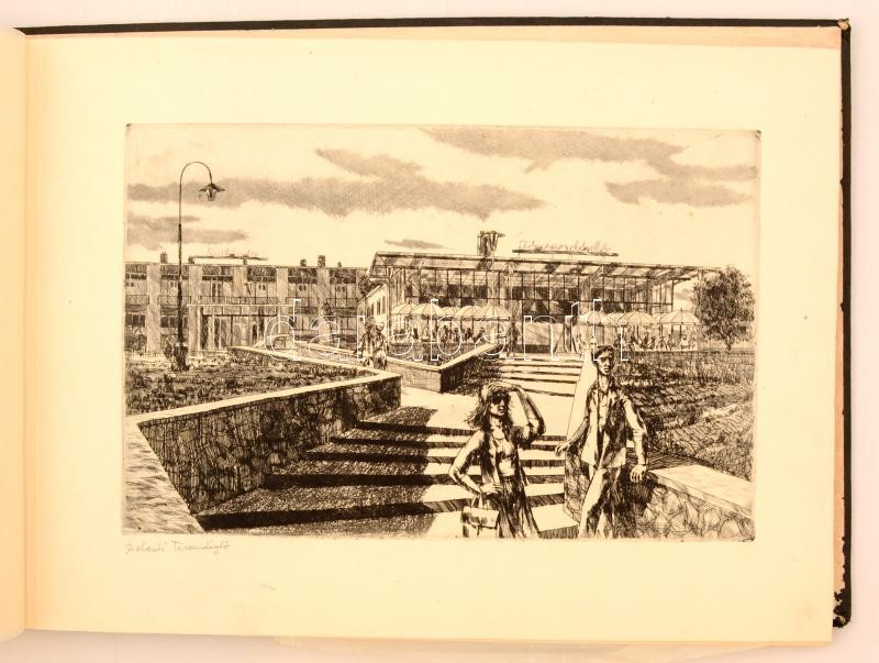 Épülő szocializmus, propaganda rézkarcok (16 db) mappában: Kondor Lajos, Veszprémi Zoltán, Kővári Sándor, Csanády András, Palkó József, Goór Imre, Maros Tordai Anna, 2 db jelzés nélkül, 19×29 cm