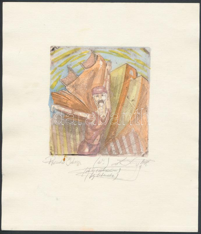 Beschreibung: Olvashatatlan jelzéssel: Pszeudo Ikarusz. Színezett rézkarc, papír, 11×10 cm