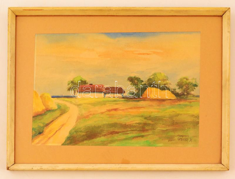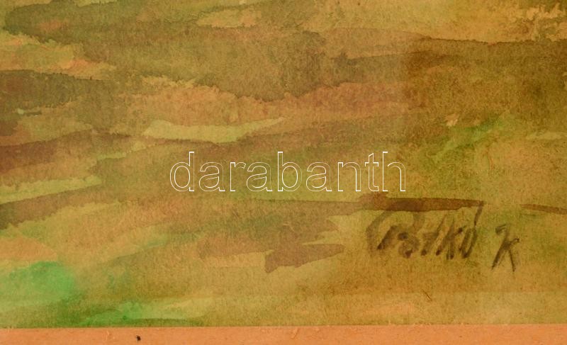 Beschreibung: Patkó jelzéssel: Tanya. Akvarell, papír, üvegezett keretben, 22×33 cm