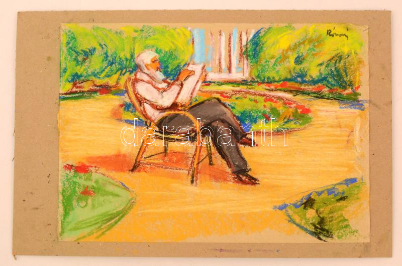 Beschreibung: Rónai jelzéssel: Újságolvasás a kertben. Pasztell, papír, 30×44 cm
