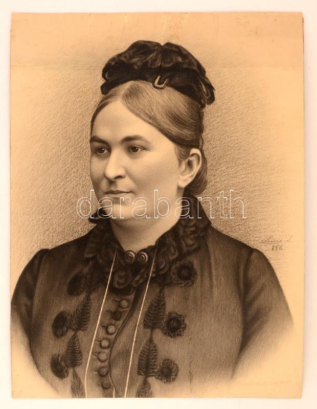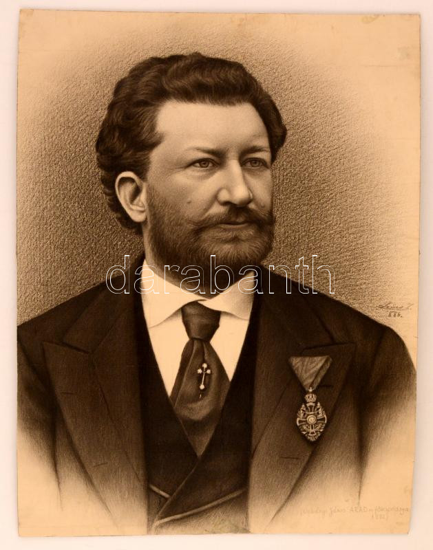 1886 Urbányi János (1832-1893) aradi rendőr főkapitány (szabadkőműves) ceruzával rajzolt portréja, hajtókáján a Ferenc József látogatása alkalmából kapott lovagkereszt. Valamint felesége Kirillovits Vilma (1839-?) portréja. Mindkettő jelzett. Szűcs I. 1886. Nagyméretű ceruzarajz, kartonra kasírozva. 59x44 cm / 1887 Pencil drawn portrait of police chief of Arad, Urbányi (freemason) and his wife.